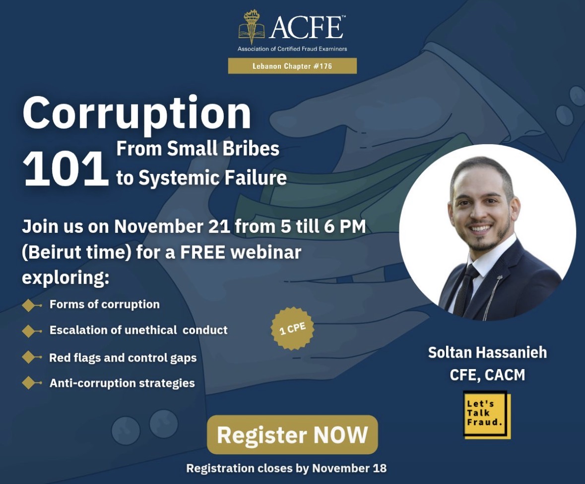 Join us for a free webinar hosted by the ACFE Lebanon Chapter on november 21 (5–6 pm beirut time) with Soltan Hassanieh, CFE, CACM as we explore how small unethical actions can escalate into large-scale systemic corruption.